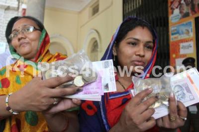 People seen displaying the ink mark on their fingers and the cash after exchanging the demonetised Rs 500 and Rs 1000 currency notes at a bank, in Bengaluru on Wednesday 16th November 2016