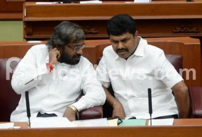 Photo Caption : Minister Eshwar Kandre seen in a conversation with BJP MLA BY Raghavendra during the winter session of Karnataka Assembly at Suvarna Vidhana Soudha at Belagavi on Friday 25th November 2016