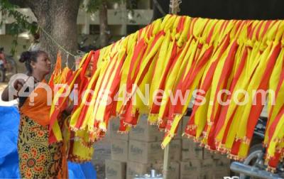 Photo Caption : Karnataka flags being sold on the roadside during the 82nd edition of Akhila Bharata Kannada Sahithya Sammelana, a three day State sponsored literary festival, began in Raichur on Friday 2nd December 2016