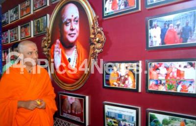 Photo Caption : Sri Nirmalanandanatha Swamiji of Adichunchanagiri Mutt going through the photo exhibition during Hindu Spiritual and Seva Mela at National College Grounds, in Bengaluru on Thursday 15th December 2016