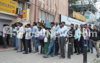 People were standing in long queues to withdraw cash from limited ATMs functioning, even though the shutters of the ATMs were down, in Bengaluru on Friday 16th December 2016