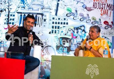 Photo Caption : Sudha Murthy seen with Chetan Bhagat at the Bangalore Literature Festival at the Royal Orchid Hotel, Old Airport Road, in Bengaluru on Saturday 17th December 2016