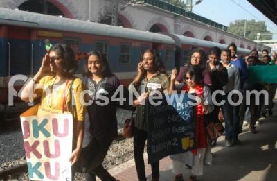 Photo Caption : Members of Citizens of Bengaluru, Music Composer Raghu Dixit, students and fellow citizens formed human Chain on Bangarpet Bound passenger train in a campaign “Chuku Buku Beku†campaign in support for a commuter rail project for the Bengaluru City as the traffic situation of Bengaluru has worsened and demand for more commuter rail projects instead of constructing flyovers, the campaign was held at Cantonment Railway Station, in Bengaluru on Saturday 17th December 2016