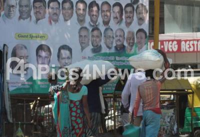 Photo Caption : Jobless labourers seen with their belongings in search for new jobs, walk past a huge cut out of politicians, as most of the labours are jobless due to demonetisation, in Bengaluru on Monday 19th December 2016