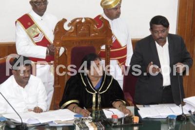 Photo Caption : Mayor G Padmavathi with Deputy Mayor Anand and BBMP Commissioner N Manjunath Prasad during BBMP Council at BBMP, in Bengaluru on Tuesday 20th December 2016