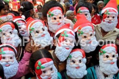Photo Caption : Children wears Santa Claus masks during blankets and cake distribution programme to the slum children on the eve of Christmas, organized by Bharathinagar Residents Association at Bharatinagar, in Bengaluru on Friday 23rd December 2016