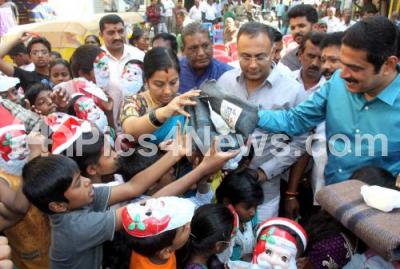 Photo Caption : MLAS Dinesh Gundu Rao and MLC Tara distributing blankets and cakes to the slum children on the eve of Christmas, organized by Bharathinagar Residents Association at Bharatinagar, in Bengaluru on Friday 23rd December 2016