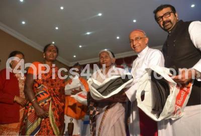 Photo Caption : Archbishop Bernard Moras with MLA NA Harris distributing blankets to poor people during the Christmas celebration program at Jasma Mandir at Neelasandra, in Bengaluru on Friday 23rd December 2016