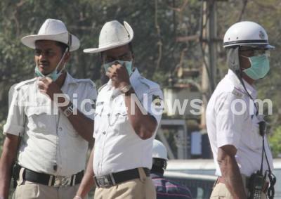 Traffic policemen brave pollution by covering their mouth with pollution masks at the busy Hebbal junction, which is highly polluted during the peak hour traffic time, in Bengaluru on Saturday 24th December 2016