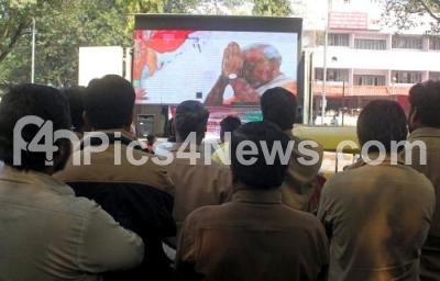 Photo Caption : Auto Rickshaw drivers watching PM Narendra Modi Note Abhiyana (Currency Demonetization) programme at City Railway Station, in Bangalore on Sunday 25th December 2016