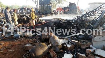 Photo Caption : 800 gas cylinders stored near a godown exploded in succession near Chintamani and firemen were called in to dose off the fire, which was caused due to explosion and three lorries stacked with cylinders were reduced to ashes at SLN Gas Agency at Thimmapura in Chintamani Taluk on Monday 26th December 2016