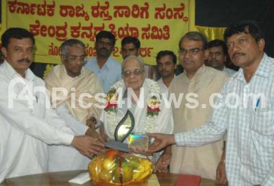 Photo Caption : Prof LS Sheshagiri Roa being felicitated by Prof SG Siddharamaiah, President Kannada book authority at Kannada Sahitya Parishath organised by KSRTC and Kannada Kriya Samithi, in Bangalore on Tuesday 4th Dec 2007