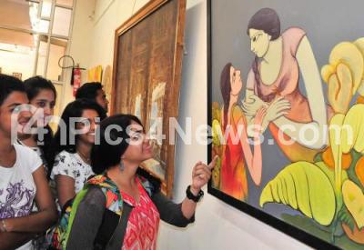 Photo Caption : Visitors seen admiring the painting exhibition invited artistes at Chitrakala Parishat, in Bengaluru on Wednesday 11th January 2017