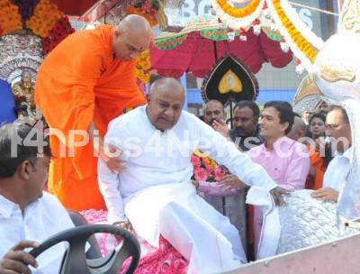 Photo Caption : HD Devegowda, Former PM of India being helped by Sri Nirmalanandanatha Maha Swamiji at the procession during the inauguration of the Founders Day and BGS Utsav 2017 at BGS Health and Education City, Kengeri, in Bengaluru on Thursday 12th January 2017