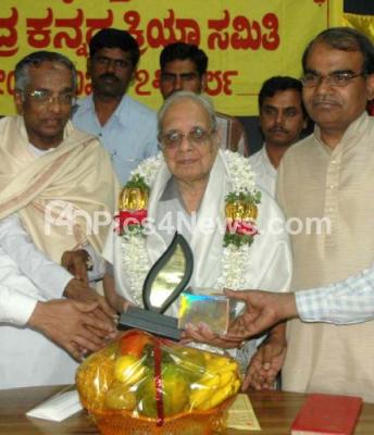 Photo Caption : Prof LS Sheshagiri Roa being felicitated by Prof SG Siddharamaiah, President Kannada book authority at Kannada Sahitya Parishath organised by KSRTC and Kannada Kriya Samithi, in Bangalore on Tuesday 4th Dec 2007