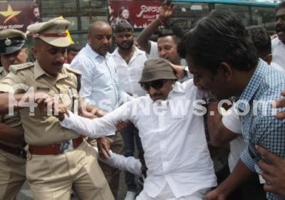 Photo Caption : Vatal Nagaraj being arrested during the protest in demand for withdrawing the court cases against the protesting farmers during the Mahadayi and Kalasa Banduri Projects protests, the protest was held at SBM Circle, in Bengaluru on Monday 23rd January 2017