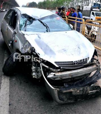 Photo Caption : Wrecked car which hit two wheeler at Jakkur Airport Road, in which 2 persons died, in Bengaluru on Thursday 26th January 2017