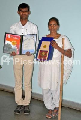 Photo Caption : Disabled students Venkatesh M and Boreddy display their certificates and gold medals during 52nd Annual convocation of Bangalore University at Jnana Jyothi Auditorium, in Bengaluru on Friday 27th January 2017
