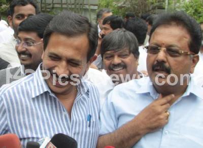 Photo Caption : JDS Rebel MLAs Balakrishna and Cheluvaraya Swamy coming out from CM Home office Krishna after meeting CM Siddaramaiah, in Bengaluru on Friday 27th January 2017