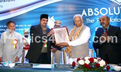 Photo Caption : Governor Vajubhai Vala being felicitated during “Peace Symposium Bengaluru 2017†organised by Ahmadiya Muslim Community at Hotel Magrath, also seen are Janab Musaddiq Ahmad Sahib, President Ahmadiyya Muslim, Prof Dr Baraguru Ramachandrappa and others, in Bengaluru on Sunday 29th January 2017
