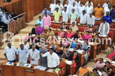 Photo Caption : Congress councilors seen protesting against the BJP Councilor Umesh Shetty statement on Mayor Padmavathi during the BBMP Council Session at BBMP, in Bengaluru on Monday 30th January 2017