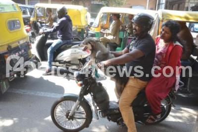 Photo Caption : Two wheeler rider carrying his pet dog on his scooter at Jayanagar, in Bengaluru on Tuesday 31st January 2017