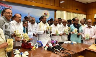 Photo Caption : CM Siddaramaiah with Minister TB Jayachandra and others received the Dr Sarojini Mahishi report by Kannada Development Authority Committee during a meeting at Krishna, in Bengaluru on Wednesday 1st February 2017