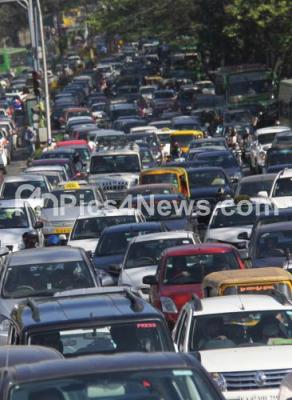 Photo Caption : Heavy traffic jam reported at Bellary Road, in Bengaluru on Thursday 2nd February 2017