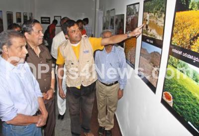 Photo Caption : Former Lokayukta N Santhosh Hegde with Film Director Suresh Heblikar and others looking at the mining photo exhibition of Sudhir Shetty at Rangoli METRO Station, MG Road, in Bengaluru on Sunday 5th February 2017