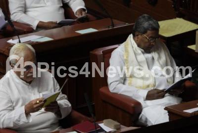 Photo Caption : CM Siddaramaiah with Minister RV Deshpande seen referring the Joint Session speech book, as Governor Vajubhai Vala was addressing at the Joint Session at Vidhan Soudha, in Bengaluru on Monday 6th February 2017