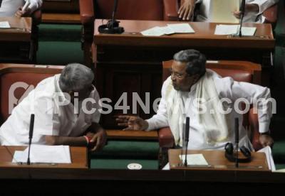 Photo Caption : CM Siddaramaiah in conversation with JDS MLA HD Revanna during the Assembly Session at Vidhana Soudha, in Bengaluru on Wednesday 8th February 2017