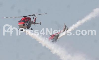 Photo Caption : Sarang aerobatic team seen performing at the rehearsals for the upcoming Aero India 2017 at Air Force Station Yelahanka, in Bengaluru on Sunday 12th February 2017