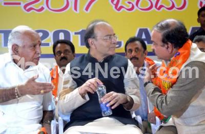 Photo Caption : Union Minister Arun Jaitley with Karnataka BJP State President BS Yeddyurappa and Union Minister Ananth Kumar during discussion program on Budget 2017 at Hotel Woodlands, in Bengaluru on Monday 13th February 2017