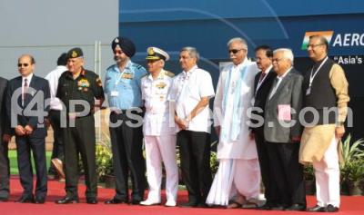 Photo Caption : Union Defense Minister Manohar Parikkar, Union Minister for Civil Aviation P Ganapathi Raju, Karnataka Industry Minister RV Deshpande seen during inauguration of AERO INDIA 2017 at Air force station , Yelahanka, in Bengaluru on Tuesday 14th February 2017