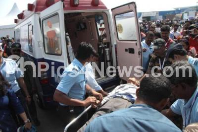 Photo Caption : An elderly man being shifted to the ambulance vehicle after he got tired due dehydration during 4th day of the 11th biennial edition of AERO INDIA 2017 at Yelahanka Air base, in Bengaluru on Friday 17th February 2017