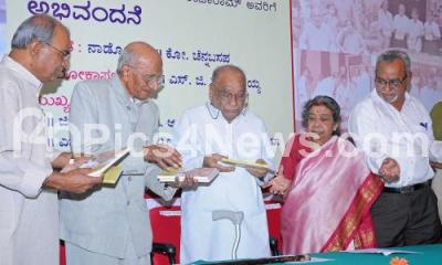 Photo Caption : R S Rajaram, Navakarnataka Publisher with Nadoja Dr Ko Channabasappa and Prof GS G Siddaramaiah, Dr G Ramakrishna, Dr C R Chandrashekar and others releasing “Srustiya Sele†book at Gandhi Bhavan during R S Rajaram, Nava Karnataka Publisher programme organised by MS Krishnana Smarana Institute and Nava Karnataka Publications at Gandhi Bhavan, in Bengaluru on Sunday 19th February 2017