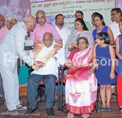 Photo Caption : RS Rajaram, Nava Karnataka Publisher and his wife being felicitated by Nadoja Dr Ko Channabasappa and Prof GS G Siddaramaiah during his felicitation programme organsied by MS Krishnana Smarana Institute and Navakarnataka Publications at Gandhi Bhavan, also seen are Dr G Ramakrishna, Dr CR Chandrashekar and others at Gandhi Bhavan, in Bengaluru on Sunday 19th February 2017