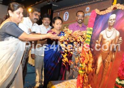 Photo Caption : Minister Umashree with Dr M S Ashadevi, Dhananjay and others seen tribute to the portrait of Sarvajna, Kannada Poet, on the occasion of Sarvajna Jayanthi at Nayana, in Bengaluru on Monday 20th February 2017