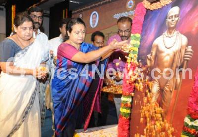 Photo Caption : Minister Umashree with Dr M S Ashadevi, Dhananjay and others seen tribute to the portrait of Sarvajna, Kannada Poet, on the occasion of Sarvajna Jayanthi at Nayana, in Bengaluru on Monday 20th February 2017