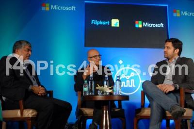 Photo Caption : Satya Nadella, CEO Microsoft is seen with Binny Bansal, CEO and Co Founder Flipkart and Nandan Nilekani during the Flipkart and Microsoft cloud partnership press conference at Hotel JW Marriot, in Bengaluru on Monday 20th February 2017