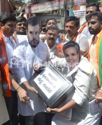 Photo Caption : Members and leaders of BJP Yuva Morcha staging a protest demonstration demanding the resignation of CM Siddaramaiah following the alleged “Diary Exposure†on kickbacks at SBM Circle, in Bengaluru on Friday 24th February 2017