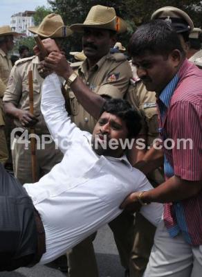 Photo Caption : Various Kannada Activists being arrested at Chalukya Circle during their protest for Yettinahole Project, in Bengaluru on Monday 27th February 2017