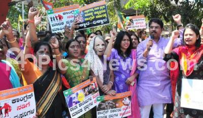 Photo Caption : Members of BJP Mahila Morcha Bengaluru City protesting against Congress Govt for not controlling drug mafia in the Schools in Bengaluru City, the protest was held at Gandhi Statue, in Bengaluru on Tuesday 28th February 2017