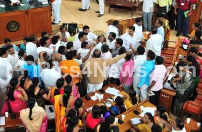 Photo Caption : BJP councilors protesting at BBMP Council Meeting, in Bengaluru on Tuesday 28th February 2017