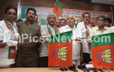 Photo Caption : K Jayprakash Hegde, Senior Congress Leader, Ratan Singh, Ex MLA, Meghanath Shetty seen joining the BJP party in the presence of BS Yeddyurappa, Jagadeesh Shettar, R Ashok and others at BJP Party Office, Malleswaram, in Bengaluru on Wednesday 8th March 2017