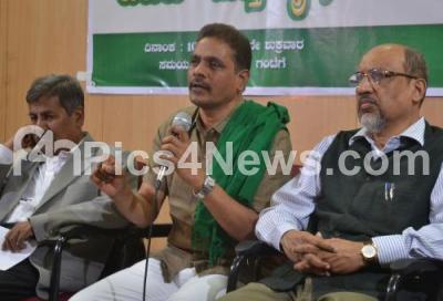 Event Description : Kodihalli Chandrashekhar, Farmers State President with Dr Prakash Kammaradi, Dr Shivanna, Deputy Vice Chancellor Agriculture University and others seen addressing the seminar on State Budget and Agriculture at Press Club, in Bengaluru on Friday 10th March 2017