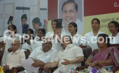 Photo Caption : Ministers RameshKumar and Roshan Baig with Mayor Padmavathi and others distributed Tabs to nurses of primary Health centres for effective PHC Management information system (MIS) to help primary Health Centres, under E Health program at Banquet Hall, Vidhan Soudha, in Bengaluru on Friday 10th March 2017