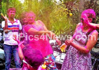 People celebrate Holi on the occasion of Holi festival, in Bengaluru on Monday 13th March 2017