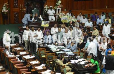 Photo Caption : BJP legislatures protesting against state government for the recent Diary controversy during the Budget Session at Vidhan Soudha, in Bengaluru on Thursday 16th March 2017