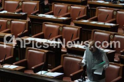 Photo Caption : Minister TB Jayachandra addressing, surrounded by empty seats, during the question hour at the Budget Session at Vidhan Soudha, in Bengaluru on Thursday 16th March 2017